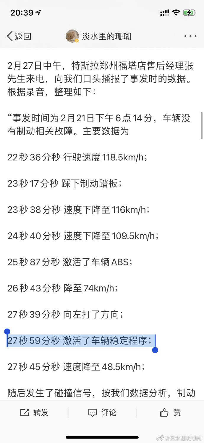 随后特斯拉在官方微博发文表示,4月25日上午11时02分,特斯拉已经与张女士家属取得联系,并进行了电话沟通。特斯拉表达了进一步沟通的意愿和诚意。张女士家属表示,张女士需要休息两天,之后再联系。特斯拉十分感谢张女士家属的回应。