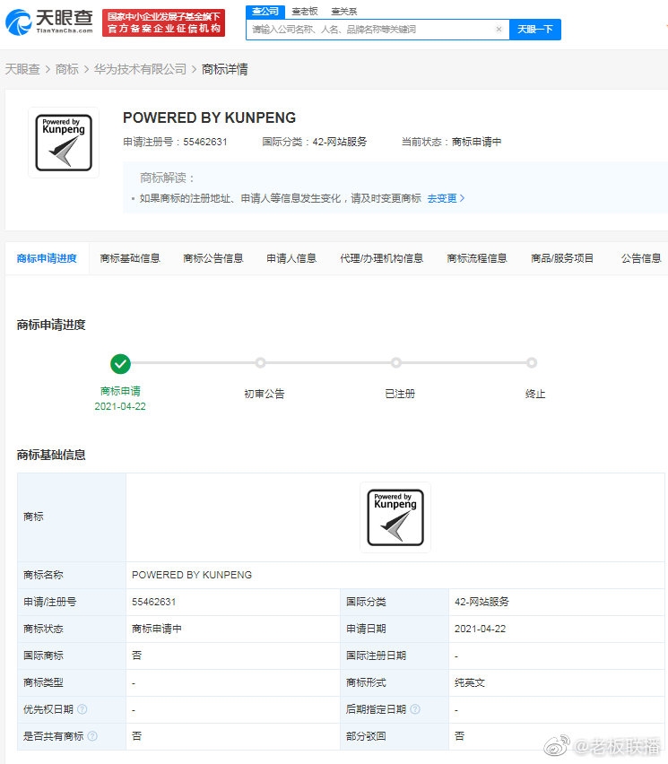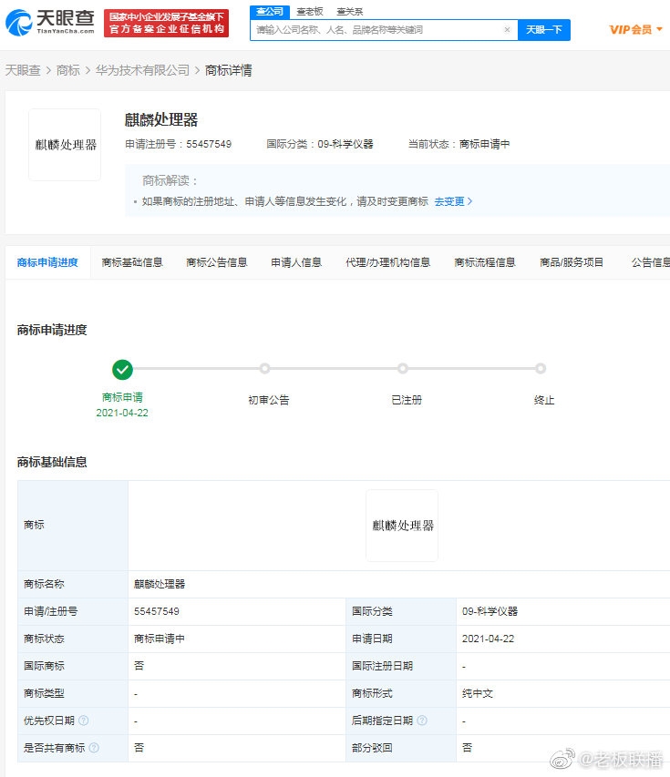 尽管芯片已经没有办法生产,但华为依然没有放弃海思、麒麟团队。5月10日下午消息,天眼查App显示,近日,华为技术有限公司申请注册“麒麟处理器”“POWERED BY KUNPENG”等相关商标,现国际分类涉及科学仪器、网站服务,商标状态为“商标申请中”。