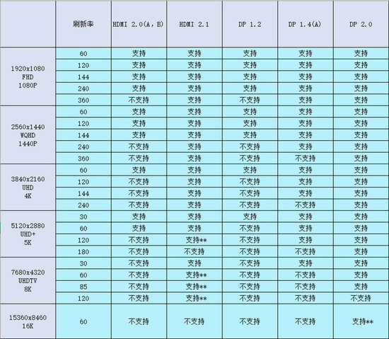 而需要注意的是,加注了**的部分,意味着这一个支持并非原生输出支持,而是需要采用DSC压缩算法,通过对特定色彩、信息的压缩才可以达到这一个分辨率的支持。但是在实际上使用上,到了如此高的分辨率,一般肉眼也无法看出很大的差距。