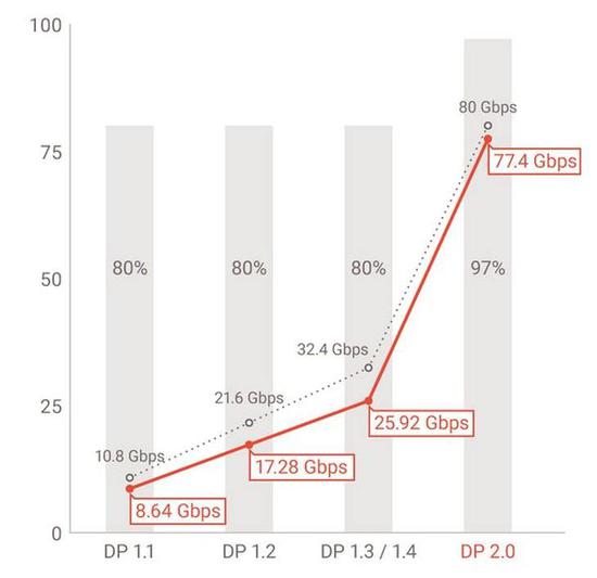 我们以HDMI2.1和DP2.0来进行对比,HDMI 2.1正式的发布时间是在2017年,而DP2.0正式的发布时间则是在2019年,两个标准的时间差有两年。HDMI 2.1可以支持到最高的48Gbps传输速度,而根据VESA 所制定的规范,DP 2.0可以支持到最高80Gbps的传输速度。