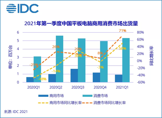 2021年第一季度中国平板电脑商用市场出货量约93万台,同比增长49.7%。虽然政府“人口普查”项目结束,但其它行业商机有所恢复。除教育依然保持增长外,“新冠疫情”也对一些大型企业的数字化转型和提升有所推动。另外去年一些行业采购因为疫情也相应延迟到今年。消费市场出货约532万台,同比增长71.3%。从市场角度来看,除个别品牌机型购买困难以外,大部分机型市场供应都较为充足。即便出现供应不足的情况,短时间内也能解决恢复。