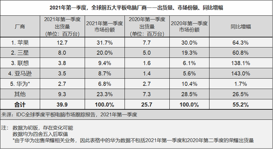 由于目前世界上大部分地区仍在应对“新冠疫情”,导致了平板电脑的销量依旧火爆。国际数据公司(IDC)全球平板电脑季度跟踪报告的初版数据显示,平板电脑市场在2021年第一季度表现出色,同比增长55.2%,出货量总计3,990万台。这种规模的增长自2013年第三季度同比增长56.9%以后再次出现。