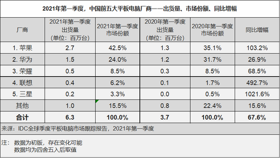 2021年第一季度中国平板电脑市场主要厂商概览: