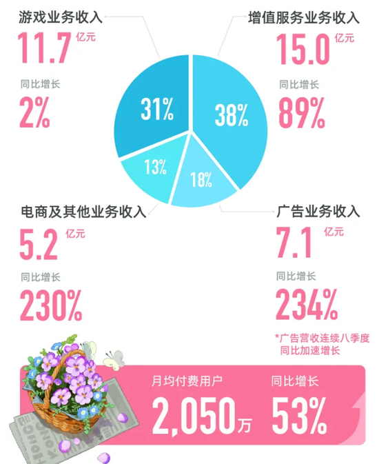 其中,广告业务实现了连续八个季度的同比加速增长,同比增长234%,达7亿元 。 前五大广告主行业为游戏、数码3C、食品饮料、电商及美妆护肤。 增值服务业务收入同比增加89%,达到15亿元。