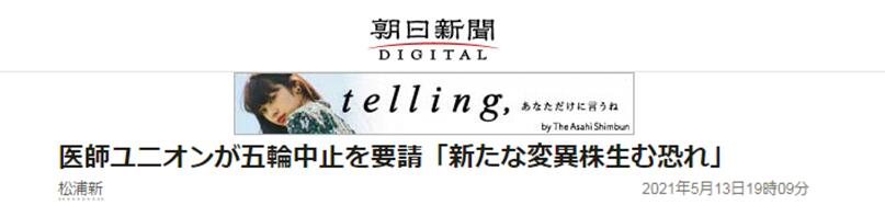 据日本《朝日新闻》报道,由日本在职医师组成的劳动组织“全国医师协会”在13日于东京都举行记者会,正式向日本内阁和厚生劳动省发出警告,要求终止举办东京奥运会。协会称,若举办东京奥运会,来自各国的数万名选手和工作人员将涌入日本,这将大幅增加新种变异毒株出现的风险。