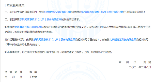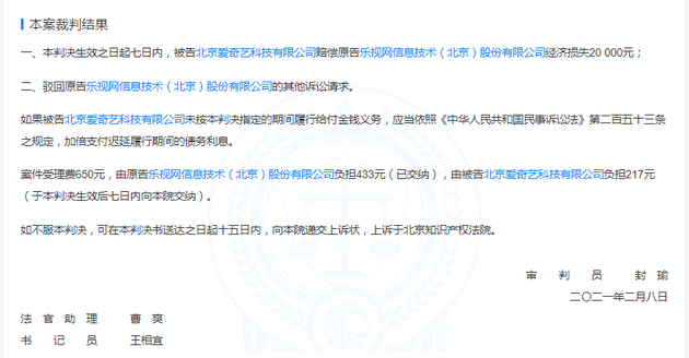 最终裁判结果:判决生效之日起七日内,被告北京爱奇艺科技有限公司赔偿原告乐视网信息技术(北京)股份有限公司经济损失共计50000元。