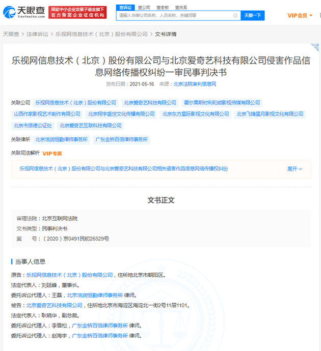 5月17日下午消息,天眼查App显示,近日,乐视网信息技术(北京)股份有限公司公开与北京爱奇艺科技有限公司侵害作品信息网络传播权纠纷的两则一审民事判决书,案号分别为(2020)京0491民初26526号、(2020)京0491民初26529号,审理法院均为北京互联网法院。原告为乐视网信息技术(北京)股份有限公司,被告为北京爱奇艺科技有限公司。