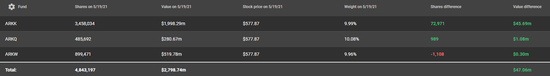 此外,Cathie Wood也在趁着近期特斯拉大跌时入场抄底。数据显示,ARK旗下持仓特斯拉的主动ETF当中,ARKK和ARKQ昨日均报告增持了特斯拉,ARKW则是小幅减持,综合之后共增持72852股,按当日收盘价计算的市值约为4210万美元,这是ARK旗下的基金自4月以来首次买入特斯拉股票。而根据统计,特斯拉最近一个月股价下跌了23%,而最近三个月的股价跌幅更是接近30%
