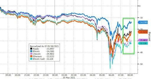 另一方面,特斯拉CEO马斯克在个人社交媒体账号上发布了“特斯拉有钻石手(Diamond Hand)”的消息。有市场观点将其解读为特斯拉不会抛售手中已有的比特币,而这条消息也让比特币的24小时跌幅从之前的超过30%收窄到大约14%。