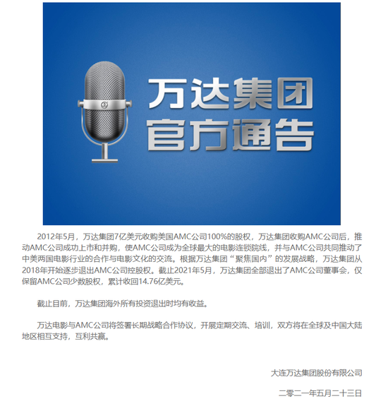从2018年起,万达开始逐步减持AMC。去年10月,万达还持有AMC近40%的股权,如今已降至0.002%。5月23日,大连万达集团在其官网发布消息称,公司已全部退出了AMC董事会,仅保留少数股权,累计回笼资金14.76亿美元(约合人民币94.96亿元)。这较公司7亿美元的实际现金投资增长100%。