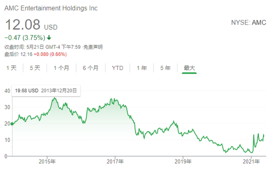 受美股散户交易驱动,AMC今年股价上涨470%,至12.08美元。