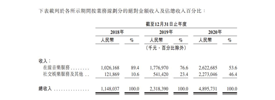 招股书显示,两大变现板块在营收中的占比逐步趋于平衡,2018年至2020年,在线音乐服务在营收中的占比分别是89.4%、76.6%和53.6%,这也意味着,2020年,社交娱乐服务及其他贡献了46.4%的营收。