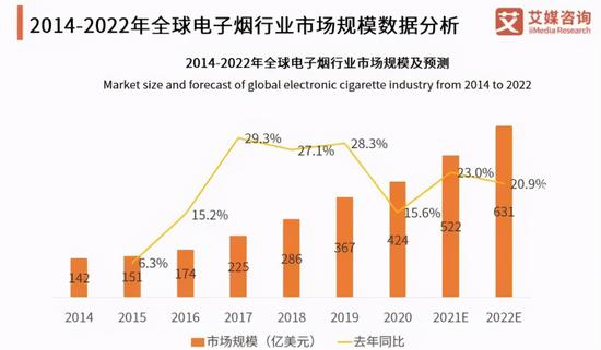 根据艾媒咨询数据,从2013年起的8年间,中国电子烟的年均复合增长高达72.5%。同时该机构预测,今年市场规模有望破100亿元。