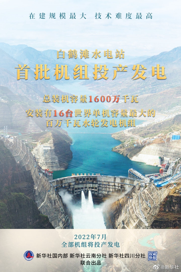 今天上午,在建规模全球第一、单机容量世界第一、装机规模全球第二大水电站——金沙江白鹤滩水电站首批机组正式投产发电。白鹤滩水电站计划于 2022 年 7 月实现全部机组投产发电。目前,白鹤滩工程建设者按照“精品工程”标准扎实有序推进后续工程建设和剩余机组安装调试工作。