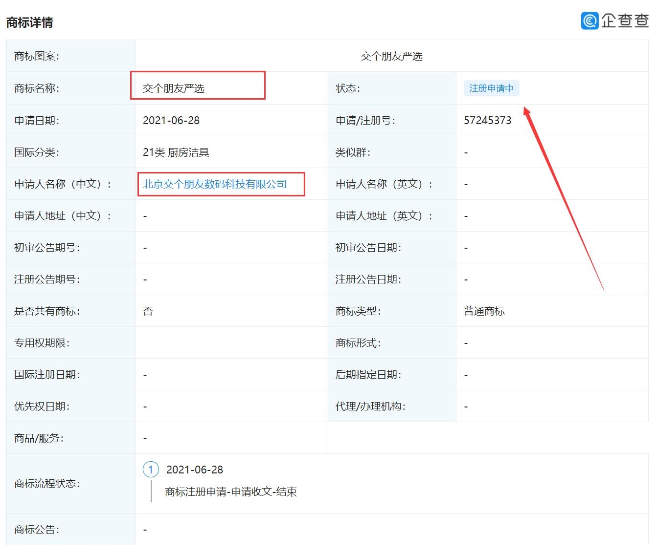 7月5日消息,企查查APP显示,近日北京交个朋友数码科技有限公司申请注册了多个“交个朋友严选”商标,国际分类涵盖了家具、乐器、啤酒饮料、日化用品、材料加工、医药、烟草烟具等,目前状态均为商标申请中。交个朋友公关部负责人吴加录表示,我们已经开始准备做自有品牌了。