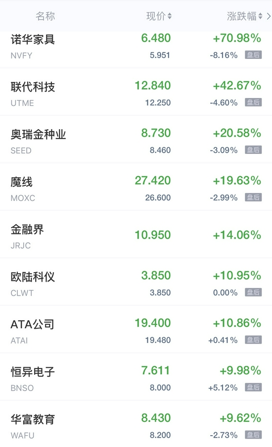 联代科技涨超42%,优信涨超4%,汽车之家涨近3%,知乎涨超2%,搜狐涨超1%。