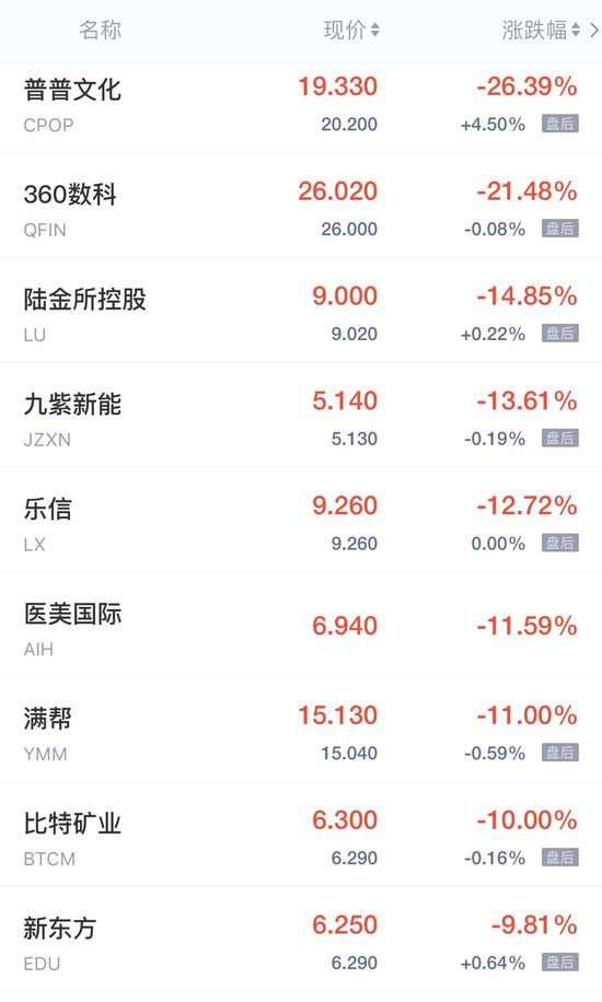 陆金所跌近15%,九紫新能跌超13%,乐信跌近13%,满帮跌超11%,比特矿业跌10%,金山云跌近7%,每日优鲜、中网载线跌超6%,世纪互联跌超5%,乐居、触宝跌超5%,迅雷跌近5%,第九城市、携程跌超4%,爱奇艺、欢聚集团、百度跌近4%,哔哩哔哩跌超3%,叮咚买菜跌近3%,BOSS直聘、虎牙、36氪跌超2%,网易跌近2%。