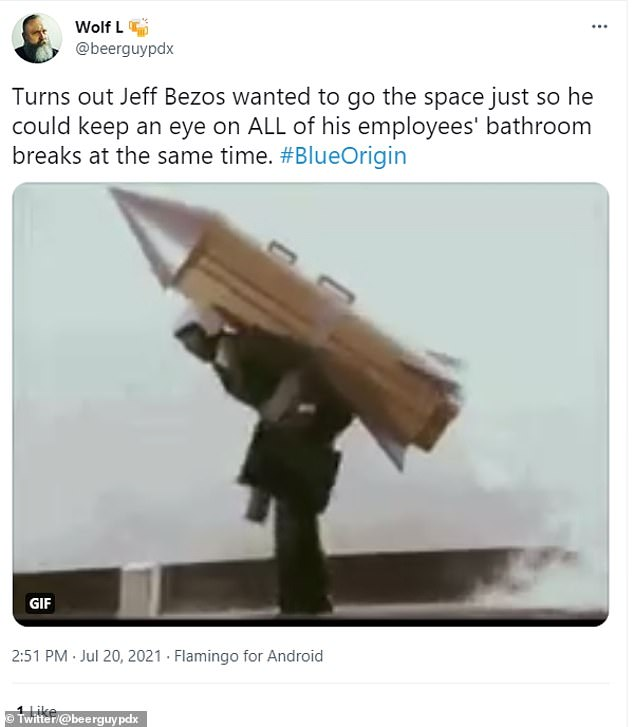 @beerguypdx在推文中表示,“贝佐斯上太空的目的,是监督亚马逊所有员工上卫生间的时间。”