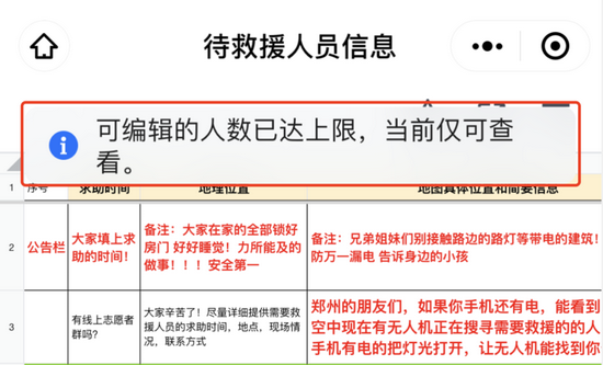 腾讯文档团队告诉记者,看到河南暴雨如此严重,在20日晚间,团队经过几分钟讨论,便开始快速分工执行上线了33个救灾模板。针对救援文档,团队将同时协作人数在200人的基础上又扩容了2倍,使得更多人可以同时填写,团队技术一直24小时轮班值守,确保产品的稳定体验。