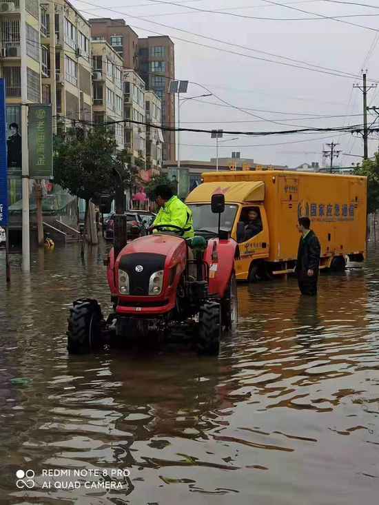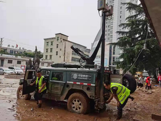 受灾最严重的米河镇镇政府门口,中国移动卫星基站车7月21日开始连续工作提供应急通信保障。