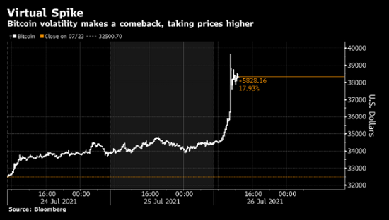 比特币周一飙升至近40,000美元,部分归功于交易员解除看跌押注以及对亚马逊可能涉足加密货币领域的持续猜测。这一全球最大加密货币盘中一度涨15%至39,681美元。香港时间10:58,涨幅收窄至38,100美元左右。以太币等其他虚拟货币也纷纷走高。