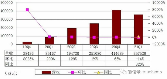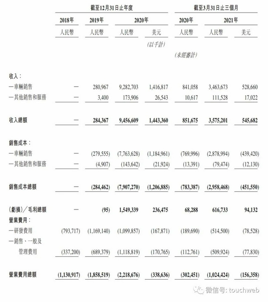 财报显示,理想汽车2018年、2019年、2020年营收分别为0、2.84亿元、94.57亿元(约14.43亿美元);理想汽车2021年第一季度营收为35.75亿元(约5.46亿美元)。上年同期营收为8.52亿元。