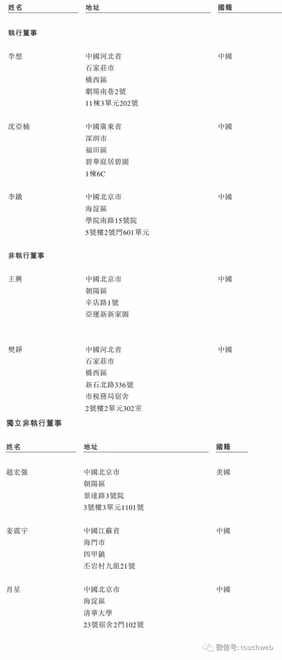 理想汽车的执行董事为李想、沈亚楠、李铁;非执行董事为王兴、樊铮;独立非执行董事为赵宏强、姜震宇、肖星。