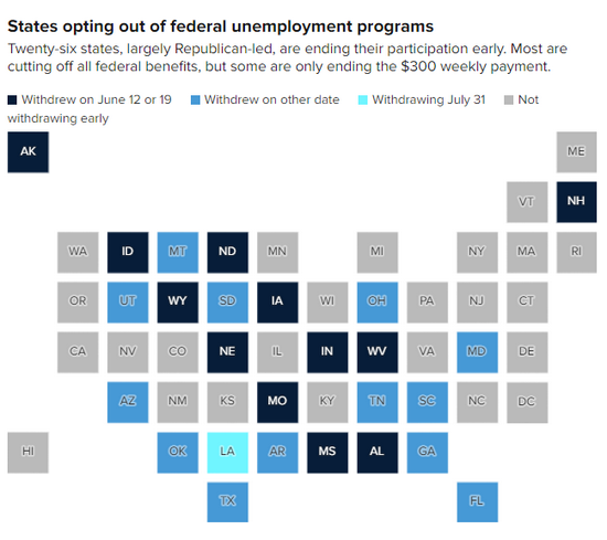 26个州在6月和7月结束了联邦失业计划的参与,试图鼓励领取失业救济金的人重返工作岗位——这实际上将居民的“福利悬崖”提前了大约两到三个月。