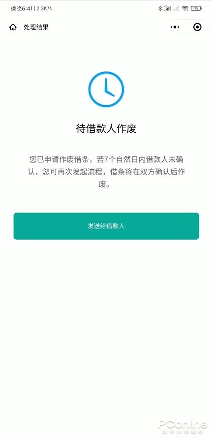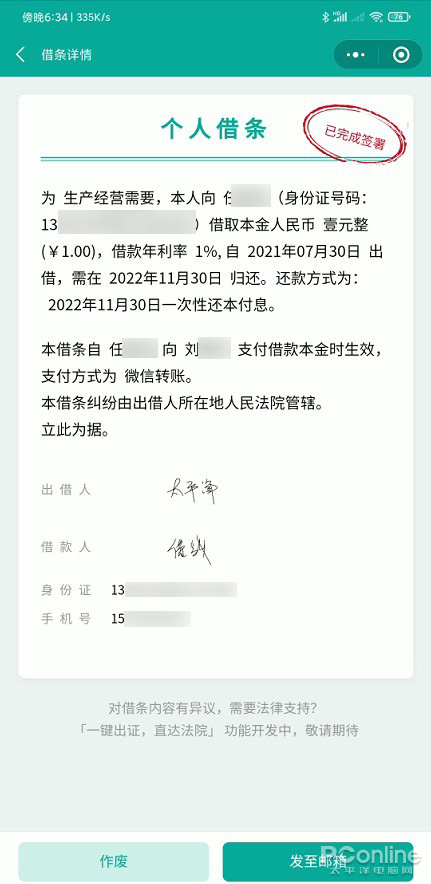 创建好的借条会通过区域链技术进行线上存证,符合《民法典》及《电子签名法》里的相关规定,同时也具备完全的法律效力。借贷双方可以根据实际情况,随时废止借条。同样的,为了安全起见,废止操作也会需要双方共同签署,操作过程与上面相似。
