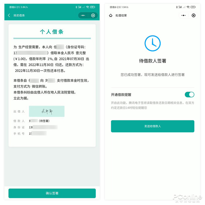 对方收到借条后的操作与上面很像,只不过不用再填写借贷信息了。微信会通过人脸识别验证对方身份,如果发现证件与人脸不符是无法完成签署操作的。最终等签署正常结束后,就会在双方的小程序借条顶端生成一个“已完成签署“图章,至此整张借条才真正具备法律效力!