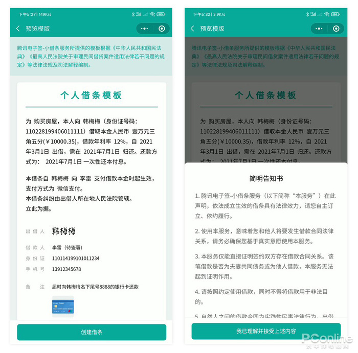 小程序总共提供了三项功能,分别是“小收据“、”小借条“和”小合同“。这里以“小借条“为例,首先我们会看到一个示例模板,点击下方的”创建借条“按钮后,就会弹出简明告知书。大体意思是腾讯只是该模板的提供者,与借贷双方没有任何法律联系。如果双方因借贷问题产生纠纷,需要依照相关法律规定自行处理。总之这一步,就是明确微信与用户之间的法律责任,即微信借条本质上并非中介撮合机构,这也是和之前的P2P平台一个很大的区别。