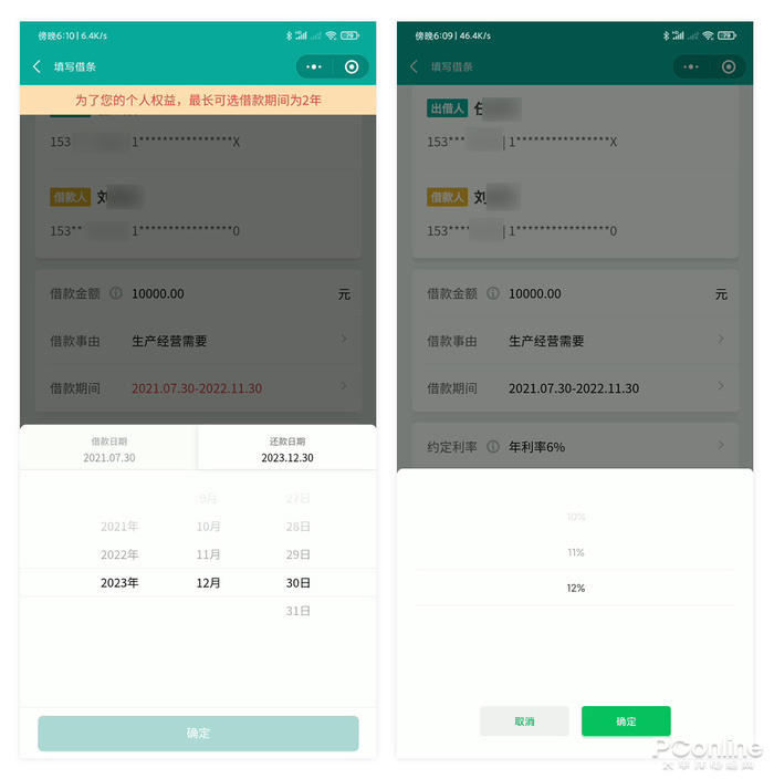 其他信息按实际填写即可,小程序对借贷双方的年龄、借款金额、借款期限、约定利率等做了一些限制,比如借贷双方年龄必须在22-60周岁之间,借款金额不得超过10万元人民币,还款期限不得超过2年,约定年利率不能超过12%等等,总之这一切都是依据《民法典》里的相关规定设计的,可以最大程度上保证借贷双方的资金安全。