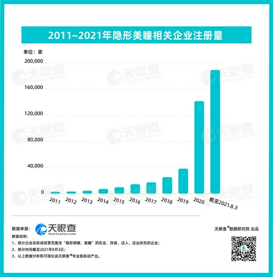 值得一提的是,截至 8 月 3 日,今年我国美瞳隐形眼镜相关企业新增注册量超 19 万家,已超过 2020 年全年隐形美瞳相关企业注册量。