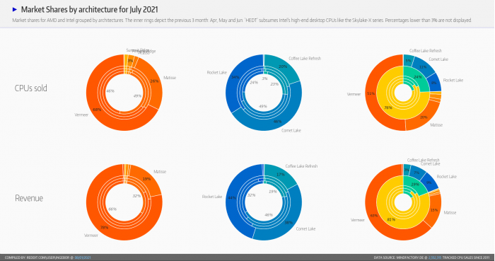 德国最大电子产品零售商MindFactory每个月都会详细统计AMD锐龙、Intel酷睿处理器的销售情况。今天,2021年7月份的战报来了。受全球大环境影响,桌面处理器的供应量在今年也非常紧张,直接反应在销量上,无论AMD还是Intel都出现了大幅下跌。