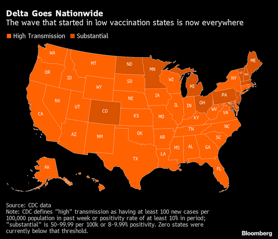 始于奥沙克山脉和南部腹地各州的新一波新冠疫情,现在已经席卷美国,病例和住院人数都达到2月以来的最高水平。美国疾病控制与预防中心(CDC)认为,38个州的传播率都在高水平,这意味着这些州每10万居民中至少报告100例病例,或阳性率至少为10%。其他12个州和美国首都华盛顿特区的传播率被认为是在相当高水平,是第二严重的级别。