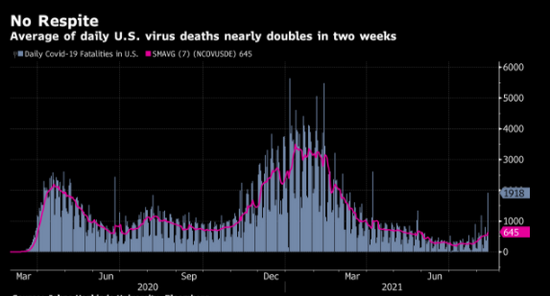 随着德尔塔毒株的广泛蔓延,美国新冠肺炎的七天平均死亡人数在周五达到645人,两周内几乎增长一倍,是5月份以来的最高水平。根据约翰霍普金斯大学和其他媒体汇总的数据,同期的日均新增感染病例增长大约66%,在周五超过12.8万,回到2月初的水平。