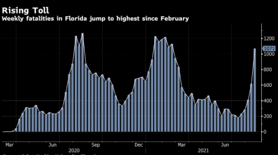 过去一周,死亡病例约四分之一在佛罗里达州。该州在截至周五的一周总共报告1071人死亡,为2月以来最高。
