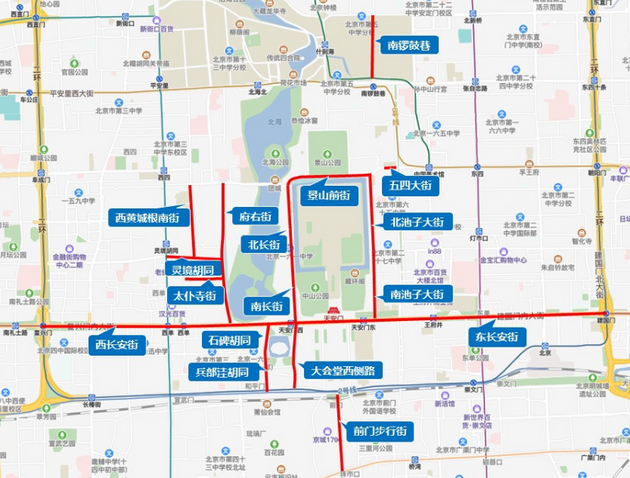 二、首都功能核心区的16个重点区域(包括机动车道、非机动车道、人行步道等的全路段)为互联网租赁自行车禁止停放区域(详见下表及示意图)。