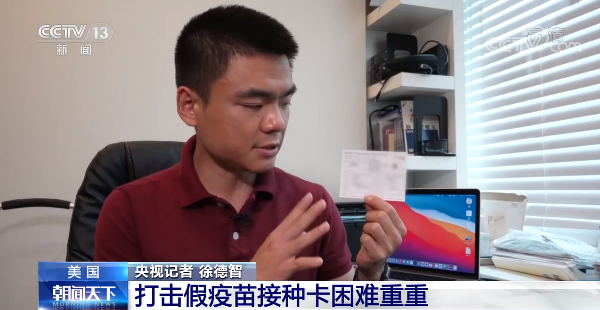 央视记者 徐德智:我手上拿的就是由美国疾控中心制作的疫苗接种卡。上面有我在今年4月接种疫苗的所有信息。那为什么会出现伪造接种卡?因为伪造的门槛实在是太低了,就是一张简单的卡片,没有任何防伪标志。