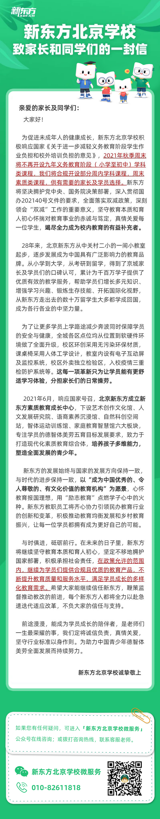 8月19日晚间消息,新东方北京学校今日在其官方微信公众号发布致家长和同学们的一封信,称为落实“双减”政策,2021年秋季周末,新东方将不再开设九年义务教育阶段(小学至初中)学科类课程,该公司将合规开设部分周内学科课程,周末素质类课程,供有需要的家长及学员选择。