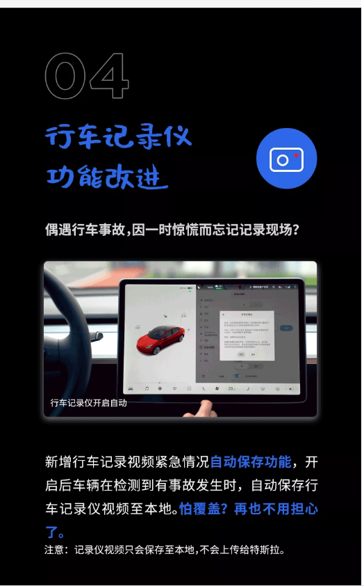 特斯拉在其后还特别附上了“注意”:记录仪视频只会保存至本地,不会上传给特斯拉。