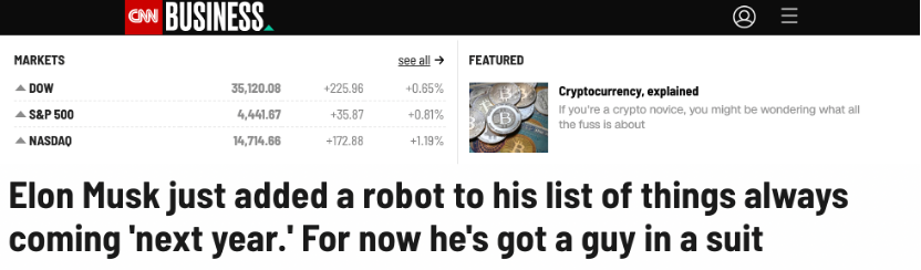 CNN(美国有线电视新闻网,Cable News Network)称伊隆·马斯克又向其长长的“明年”就发布清单中增加了一项(标题为《Elon Musk just added a robot to his list of things always coming 'next year.' For now he's got a guy in a suit》)。报道中指出,虽然马斯克在特斯拉和SpaceX中的工作颠覆了汽车和航天业,但他也以错过最后期限和过度承诺闻名。