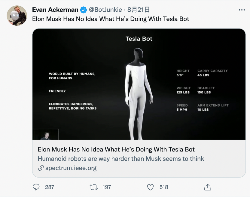 其实,就运动能力来说,要在一年内做出已经很难。工程类知名学术期刊 IEEE Spectrum 的Evan Ackerman表示,“像波士顿动力公司和敏捷机器人公司这样的公司几十年来一直在研究可以在人类环境中导航的机器人,但这仍然是一个非常困难的问题。我不知道为什么马斯克认为他可以突然做得更好。”