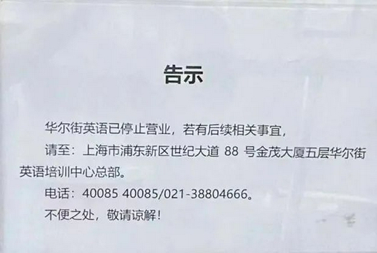 包括启文教育和华尔街英语等多家上海培训机构近期公告停业和清算。