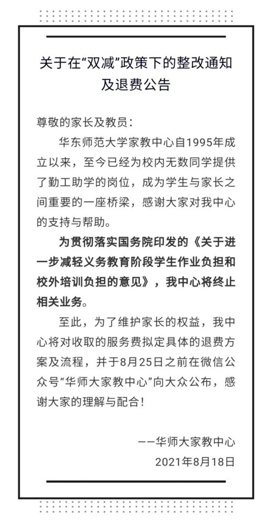 熊丙奇指出,值得注意的是,8月18日,位于上海的华东师范大学家教中心已经发布关于在“双减”政策下的整改通知及退费公告,根据该通知,华师大家教中心将终止相关业务。熊丙奇表示,这说明“双减”政策的执行非常严格,只要是机构出面的组织的上门家教,都是不被允许的,大学生家教也不过是换了一个培训场景而已。