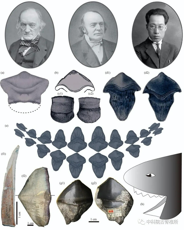 早期研究对瓣齿鲨进行系统研究的三位先驱以及他们研究的标本:理查德•欧文爵士(Richard Owen,1804-1892),英国古生物学家、动物学家,现代古生物学的奠基人之一,“恐龙(Dinosaur)”的命名者(左); b, 路易斯•阿加西(Louis Agassiz,1807-1873)生于瑞士,是一名古生物学家、冰川学家、地质学家,也是地球自然历史研究领域的一名杰出革新者(中); C, 中国古生物学的奠基人、著名古生物学家杨钟健先生(右);a:瑞士著名古生物学家路易斯阿加西命名的‘Chomatodus acuminatus;b、d:俄亥俄瓣齿鲨;c1、c2:英国著名古生物学家欧文发现的Petalodus ‘hastingsii’;e:瓣齿鲨的齿列;f1、f2:1965年刘宪亭报道的“兴国瓣齿鱼相似种;g1、g2:1950年杨钟健报道的“兴国瓣齿鱼”;h。 “兴国瓣齿鱼”的牙齿实际为巨栉瓣齿鲨(Megactenopetalus,Pristodontidae)的中下颌齿