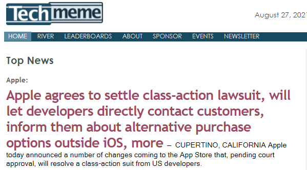 以上这 7 项调整乍一看似乎是苹果对开发者们集体诉讼的“屈服”,尤其是“允许应用开发者通过电子邮件等通信方式,向用户提供 iOS 应用之外的支付方式”这一点,在国外各大网站都登上了首页,引发众多讨论。