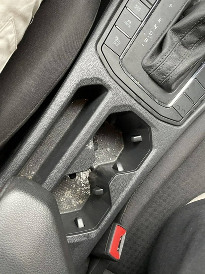 中央扶手台位置全是烟灰,似乎上一位用户将这里当成了烟灰缸。前后排的地垫就更脏了,织物座椅虽然是黑色,但能够明显感觉到黏糊糊的。