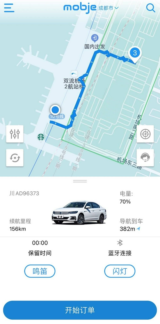 找回订单后,App显示了如下的界面。有步行路线指引我前往车辆的位置,并且显示了车牌号、电量、续航里程等信息。这辆车虽然NEDC续航有346公里,但在70%电量下表显仅有156km续航。