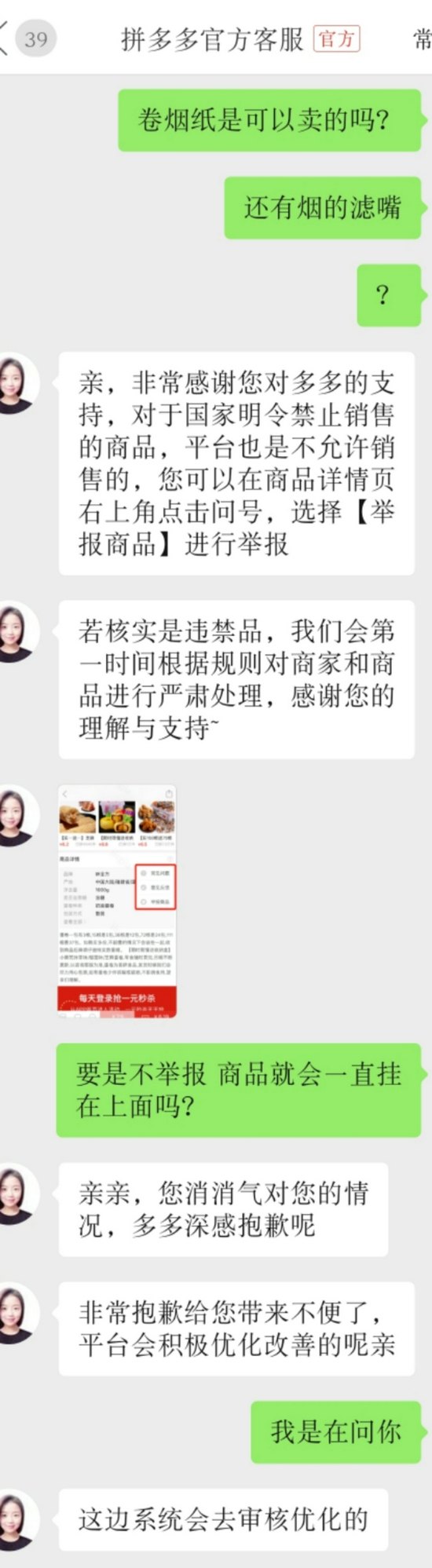 记者向拼多多客服反映平台有商家售烟卷纸时,拼多多客服回复称:“对于国家明令禁止销售的商品,平台也是不允许销售的,您可以在商品详情页点击问号,选择【举报商品】进行举报”、“若核实是违禁品,我们会第一时间根据规则对商家和商品进行严肃处理。”与淘宝和拼多多相比,京东上的烟草专卖品较少。对于京东上出现的烟草专卖品,客服回复称,“会下架所有相关商品”,并处罚店铺。
